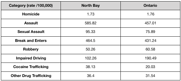 According to a recent McLeans study on crime in Canada, North Bay does have higher rates of ‘assault’, ‘sexual assault’, ‘break and enters’ and ‘cocaine trafficking’ than the provincial average. Obviously this is concerning, but when one considers the city’s geographical position as a gateway to the North, Western Canada as well as Northern Quebec, the idea that drugs would travel through and be prevalent in our city is really not overly surprising.