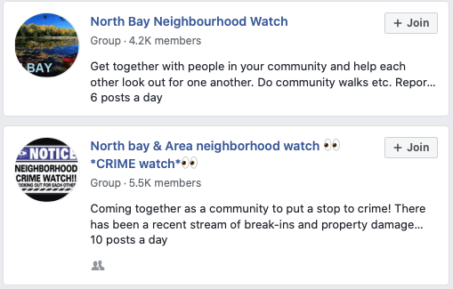 The groups currently operating emerged between 2017-2018. Initially, the groups were online communities where members could share incidents of crime as they experienced them, spreading awareness of ongoing crime in North Bay. Most of the early posts were about attempted (and successful) break and enters, warnings of suspicious people trying car doors at night, stolen bikes, news stories about crime from local outlets, you get the idea.
