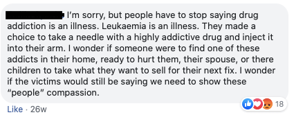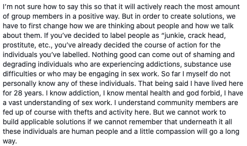 Compare the post about understanding the human level of addiction issues (left) with the comment where ‘people’ is literally put in quotation marks to imply they aren’t worthy of the title (above). (Screenshots from North Bay and Area Neighbourhood Watch *Crime Watch* Facebook Group)