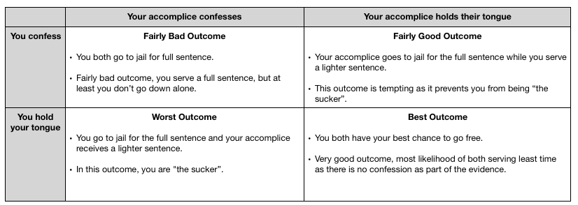 As you can see, the ideal scenario for both would be not giving up the other, as united they stand the best chance of achieving reasonable doubt and going free. The worst possible outcome for one of the suspects is holding their tongue, only to have their accomplice rat them out forcing them to face the full penalty of their crime. Thus creates a scenario where it is logical to sell out your accomplice and receive a fairly good outcome for yourself in order to prevent yourself from becoming “the sucker”.